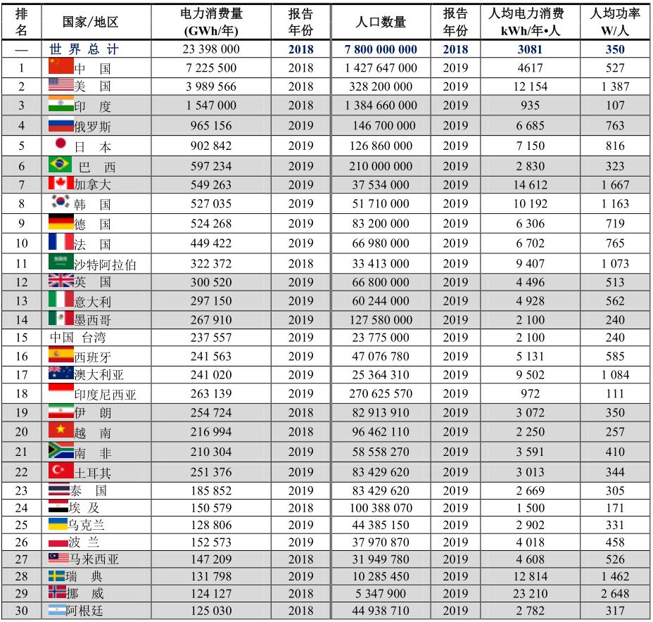全球電力消費(fèi)最高的30個(gè)國家和地區(qū)