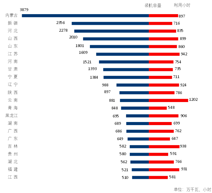 圖3 1-4月份風(fēng)電裝機(jī)較多省份風(fēng)電裝機(jī)容量和設(shè)備利用小時(shí)