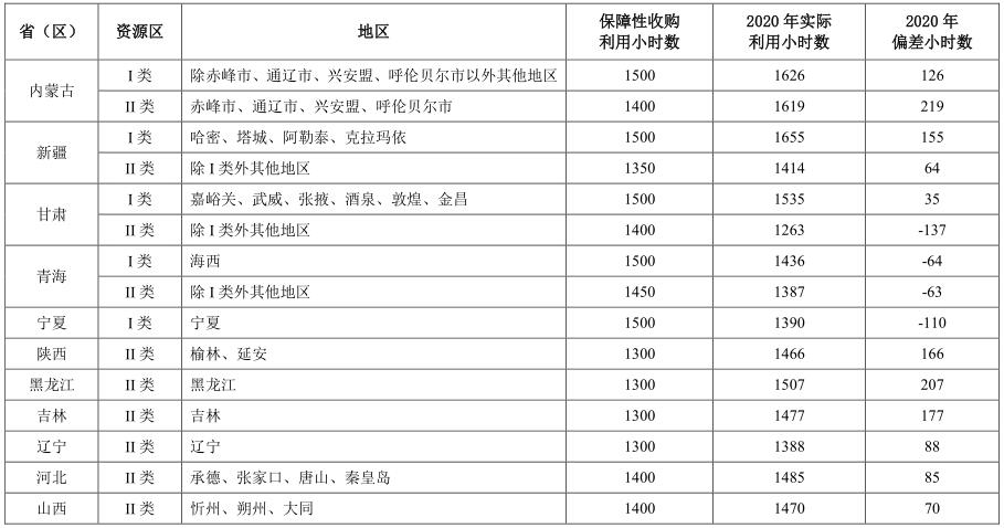 2020年,在規(guī)定風(fēng)電最低保障收購年利用小時(shí)數(shù)的地區(qū)中,甘肅III類資源區(qū)、寧夏III類資源區(qū)和山西IV類資源區(qū)未達(dá)國家最低保障收購年利用小時(shí)數(shù)要求,實(shí)際利用小時(shí)數(shù)比最低保障收購年利用小時(shí)數(shù)分別低162小時(shí)、197小時(shí)和150小時(shí)。2020年,在規(guī)定光伏發(fā)電最低保障收購年利用小時(shí)數(shù)的地區(qū)中,甘肅II類地區(qū)、青海I類和II類地區(qū)以及寧夏I類地區(qū)等4個(gè)地區(qū)未達(dá)到光伏發(fā)電最低保障收購年利用小時(shí)數(shù)要求,其中,甘肅II類地區(qū)比最低保障收購年利用小時(shí)數(shù)地區(qū)低137小時(shí);青海I類和II類地區(qū)比最低保障收購年利用小時(shí)數(shù)分別低64小時(shí)和63小時(shí);寧夏I類地區(qū)比最低保障收購年利用小時(shí)數(shù)低110小時(shí)。