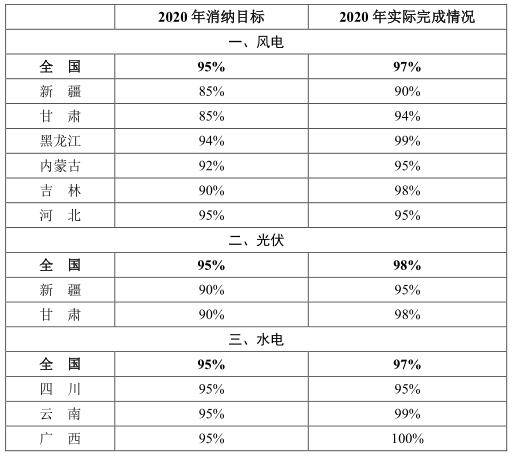 根據(jù)2018年國家發(fā)展改革委、國家能源局印發(fā)的《清潔能源消納行動(dòng)計(jì)劃(2018-2020年)》(發(fā)改能源規(guī)〔2018〕1575號),所確定的分年度風(fēng)電、光伏和水電消納目標(biāo),2020年全國平均風(fēng)電利用率97%,超過2020年風(fēng)電利用率目標(biāo)2個(gè)百分點(diǎn),重點(diǎn)省區(qū)全部達(dá)到了2020年消納目標(biāo);全國平均光伏發(fā)電利用率為98%,超過2020年利用率目標(biāo)3個(gè)百分點(diǎn),重點(diǎn)省區(qū)全部達(dá)到了2020年消納目標(biāo);全國主要流域水能利用率97%,超過2020年利用率目標(biāo)近2個(gè)百分點(diǎn),重點(diǎn)省區(qū)全部達(dá)到了2020年消納目標(biāo)。