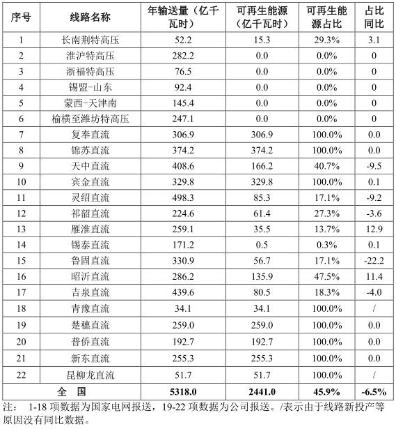 2020年,22條特高壓線路年輸送電量5318億千瓦時(shí),其中可再生能源電量2441億千瓦時(shí),同比提高3.8%,可再生能源電量占全部輸送電量的45.9%。國家電網(wǎng)運(yùn)營的18條特高壓線路輸送電量4559億千瓦時(shí),其中可再生能源電量1682億千瓦時(shí),占輸送電量的37%;南方電網(wǎng)運(yùn)營的4條特高壓線路輸送電量759億千瓦時(shí),全部為可再生能源電量。