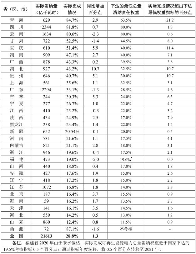 根據(jù)《國家發(fā)展改革委 國家能源局關(guān)于印發(fā)各省級行政區(qū)域2020年可再生能源電力消納責(zé)任權(quán)重的通知》(發(fā)改能源〔2020〕767號)公布的2020年各省(區(qū)、市)可再生能源電力消納責(zé)任權(quán)重,綜合考慮各省本地生產(chǎn)、本地利用以及外來電力消納情況,經(jīng)核算,除西藏免除考核外,全國30個(gè)省(區(qū)、市)都完成了國家能源主管部門下達(dá)的總量消納責(zé)任權(quán)重和非水電消納責(zé)任權(quán)重。