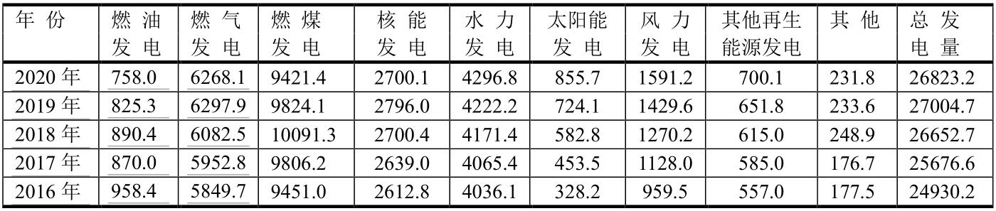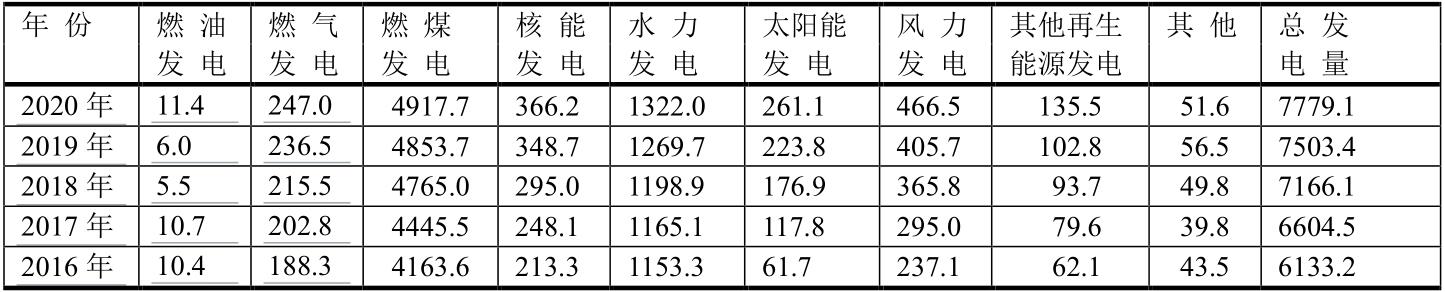 就中國發(fā)電而論,2020年燃煤發(fā)電居首位,占中國發(fā)電總量的4917.7/7779.1=63.2%;其次為水力發(fā)電、風力發(fā)電、核能發(fā)電和太陽能發(fā)電。盡管中國燃氣發(fā)電量居世界第三位,但在中國發(fā)電總量中居第六位247.0/7779.1=3.2%。