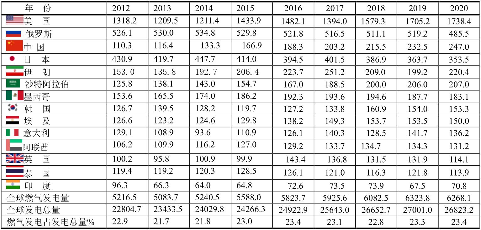 2016~2020年前14位燃氣發(fā)電最大的國家(單位:TWh)