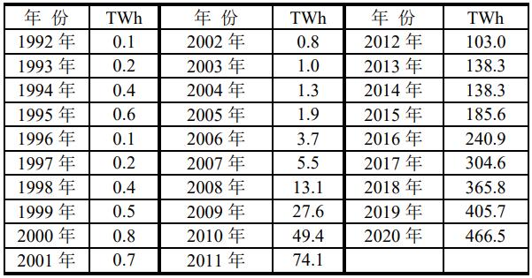 中國風(fēng)電場(chǎng)發(fā)電量進(jìn)程(單位:TWh)