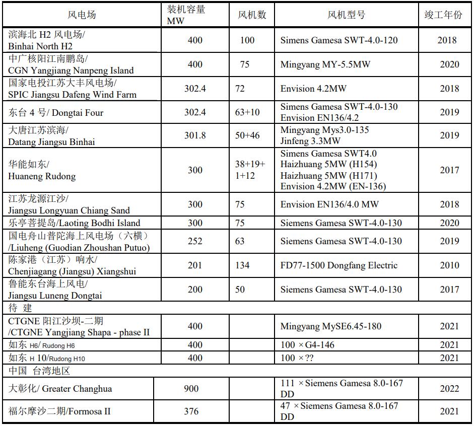中國大于200 MW運(yùn)行的海上風(fēng)電場(chǎng)