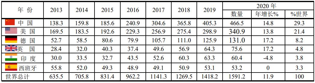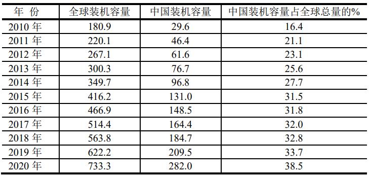 根據(jù)BP2021年的統(tǒng)計(jì),中國裝機(jī)容量占全球總量的百分率如表。