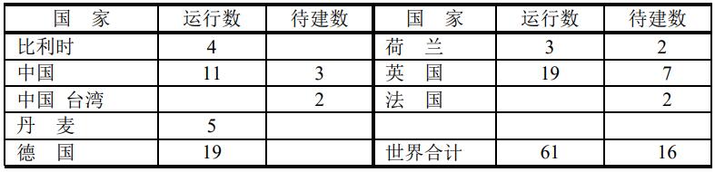目前全球裝機(jī)容量大于200 MW的海上風(fēng)電場(chǎng)有61個(gè)風(fēng)電場(chǎng)在運(yùn)行,待建的海上風(fēng)電場(chǎng)有16座。目前海上風(fēng)電場(chǎng)主要在西歐國家,如德國和英國。