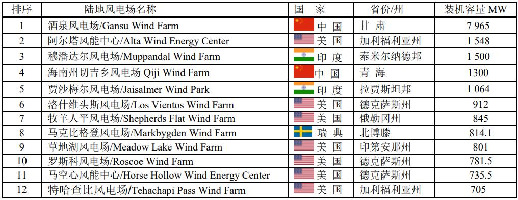 全球最大的前12大的陸上風(fēng)電場(chǎng),美國最多,占7座。盡管中國風(fēng)力發(fā)電量居全球之首,僅占2座。