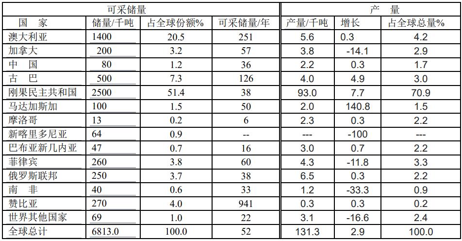 2021年底世界各國鈷的可采儲量和產(chǎn)量