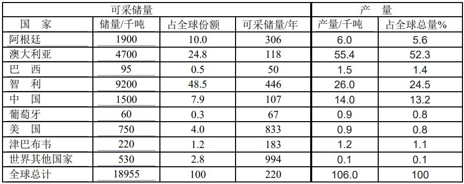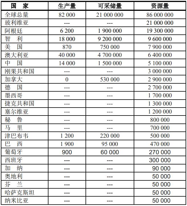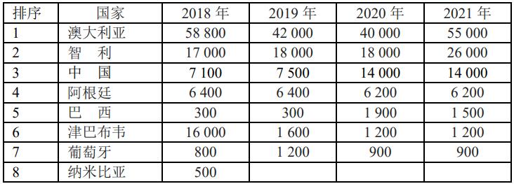 2021年底世界各國鋰的可采儲量和產(chǎn)量