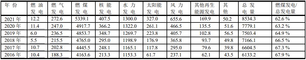 根據(jù)中國(guó)國(guó)家統(tǒng)計(jì)局的數(shù)據(jù),列出下表??梢匀菀卓闯?,中國(guó)能源是以燃煤發(fā)電為主。中國(guó)燃煤發(fā)電量占中國(guó)發(fā)電總量的百分比在逐年降低。