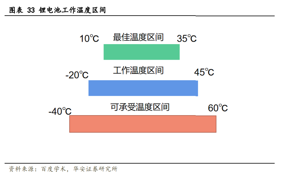 在高溫環(huán)境下,鋰電池內(nèi)部的 SEI 膜首先分解,隨后負(fù)極材料與電解液產(chǎn)生反應(yīng)、 隔膜熔融,最終正極材料及電解液發(fā)生分解。這些變化會(huì)導(dǎo)致鋰離子通道發(fā)生閉塞,引 起正負(fù)極直接接觸、短路,從而放出大量熱和氣體,導(dǎo)致內(nèi)部壓力增加,發(fā)生如電池鼓 包、破裂、泄壓閥破裂、鋁箔熔化等熱失控現(xiàn)象。熱失控一旦發(fā)生,電池內(nèi)部溫差可達(dá) 520 ℃,對(duì)安全性帶來嚴(yán)峻挑戰(zhàn)。此外,高溫會(huì)導(dǎo)致電池內(nèi)阻增加、活性材料和有效鋰 離子流失,進(jìn)而降低電池容量。 在低溫環(huán)境下,電池負(fù)極會(huì)析鋰形成鋰枝晶,嚴(yán)重時(shí)刺穿 SEI 膜,影響安全性。低 溫會(huì)導(dǎo)致電解液凝固,阻抗增加,進(jìn)而降低電池容量,根據(jù)《鋰離子電池低溫特性研究 進(jìn)展》,磷酸鐵鋰電池容量保持率 0 ℃下為 60%-70%,在−20 ℃時(shí)降低至 20%-40%。除 溫度外,電池間溫差亦會(huì)對(duì)電池性能產(chǎn)生影響。