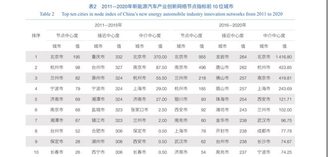 北京市、上海市和其他省會城市、首府城市是中國新能源汽車產(chǎn)業(yè)創(chuàng)新網(wǎng)絡中的核心節(jié)點,并具有引導其他城市共同開展新能源汽車專利合作的能力。由表2可知,北京市節(jié)點中心度自2011年以來始終是中國新能源汽車產(chǎn)業(yè)創(chuàng)新網(wǎng)絡中各城市的最高值,并且遠高于其他城市。這反映出北京市不僅在數(shù)量上擁有最多的新能源汽車產(chǎn)業(yè)專利,同時相對于其他城市,還與創(chuàng)新網(wǎng)絡中更多其他的節(jié)點城市開展了新能源汽車的創(chuàng)新合作。北京市在中介中心度上自2011年以來也保持著遠高于其他節(jié)點城市的數(shù)值。這反映了在新能源汽車產(chǎn)業(yè)創(chuàng)新網(wǎng)絡中,北京市擁有遠高于其他城市的在聯(lián)合其他兩個及兩個以上城市共同開展研發(fā)活動的能力。上海市的節(jié)點中心度和中介中心度自2011年以來上升顯著。同時,杭州市和南京市等其他長江三角洲城市群地區(qū)的城市也具有較高的節(jié)點中心度和中介中心度。結合圖1可知,在長江三角洲城市群地區(qū),上海市同其他城市已經(jīng)形成了復雜的新能源汽車產(chǎn)業(yè)創(chuàng)新網(wǎng)絡,同樣具有聯(lián)合其他兩個及兩個以上城市共同開展研發(fā)活動的能力。此外,相較于2011—2015年,2016—2020年的節(jié)點中心度和中介中心度排名前10名的城市中省會城市和首府城市顯著增多,這是由于省會城市和首府城市在省內(nèi)和自治區(qū)內(nèi)通常擁有更多的政策傾斜和更為豐富的企業(yè)、科研資源。隨著參與到中國新能源汽車產(chǎn)業(yè)創(chuàng)新網(wǎng)絡中的城市逐漸增多,省會城市和首府城市更有能力與率先開展新能源汽車研發(fā)的城市開展合作,或者自主開展并引導其他鄰近城市參與新能源汽車的研發(fā)活動。