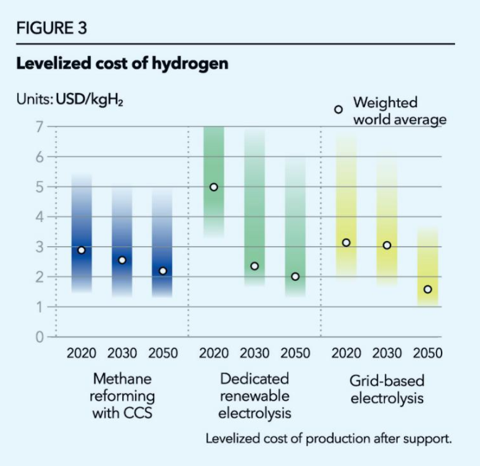 全球藍(lán)氫的平均價(jià)格將從2030年的2.5美元/公斤,下降到2050年的2.2美元/公斤。在像美國這樣擁有廉價(jià)天然氣的地區(qū),成本將在2美元之下。報(bào)告預(yù)測,在全球范圍內(nèi),綠氫將在未來十年內(nèi)達(dá)到與藍(lán)氫的成本持平。