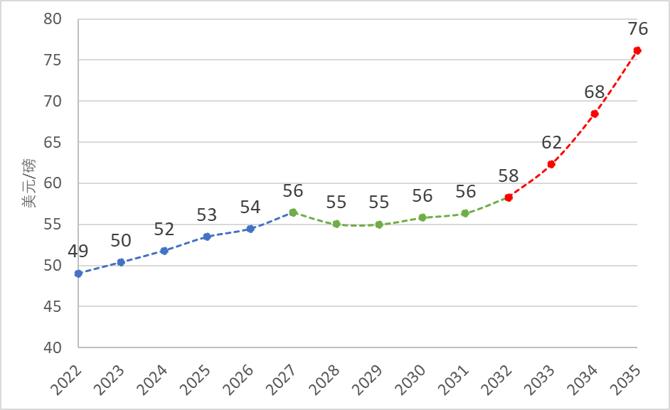 根據鈾價預測小組最新一期的預測(2022年下半年),天然鈾年度現(xiàn)貨價格在2023-2035年間將從50美元/磅上升至76美元/磅,伴隨小幅波動,但整體呈上升趨勢。主要分為以下三個階段:
