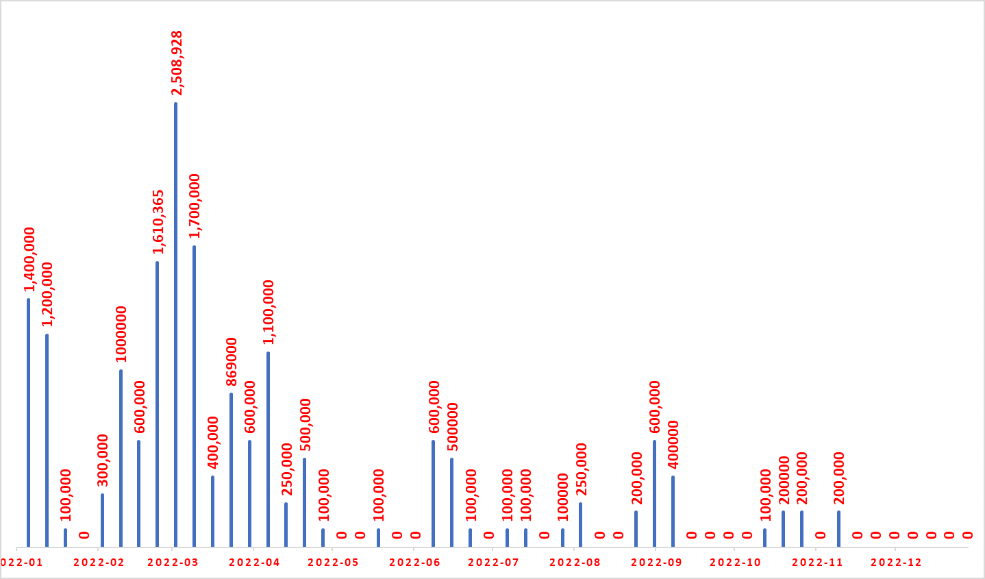 2022年SPUT每周采購情況(縱軸單位:磅)