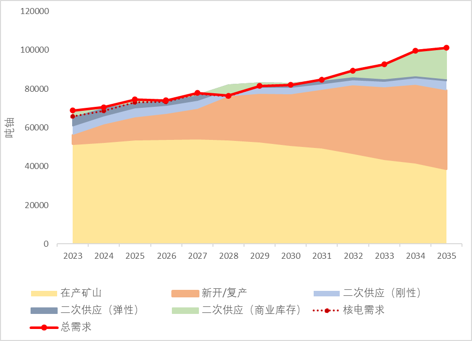 · 第三階段:2033-2035年,價格將快速上漲至76美元/磅。加拿大的Cigar Lake(2033年)、哈薩克的Kharassan 2(2033年)、Central Mynkuduk和Karatau(2035年)預計因資源耗盡而停產,盡管一批成本位于47-52美元/磅(現(xiàn)價)的勘探項目有可能投產,但總體規(guī)模較小,因此一次供應在該階段逐步下降;同時短料富集、尾料再濃縮等二次供應受制于庫存規(guī)模和市場價格,也顯著下降。需求端仍呈較大漲幅,因此剛性缺口擴大,商業(yè)庫存加速消耗,現(xiàn)貨價格進入快速上漲階段。