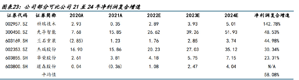 從部分有Wind一致預(yù)期的公司看,21至24年凈利潤復(fù)合增速5家企業(yè)平均值為54.85%, 其中蘭石重裝、先導(dǎo)智能預(yù)計(jì)復(fù)合增速分別約為 45%、49%,科瑞技術(shù)高達(dá) 143%,考慮其 余企業(yè)中仍有企業(yè)有望實(shí)現(xiàn)高復(fù)合增速,公司要超過 75 分位值水平(高于第五)預(yù)計(jì)凈 利潤復(fù)合增速較高,我們預(yù)計(jì)公司 21 至 24 年凈利潤復(fù)合增速為 49.69%。