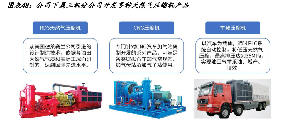 公司下屬三機(jī)分公司1982年進(jìn)入壓縮機(jī)市場(chǎng)經(jīng)驗(yàn)豐富,產(chǎn)品包括RDS系列天然氣壓縮機(jī)、 CNG 系列天然氣壓縮機(jī)等,產(chǎn)品可用于油氣井增產(chǎn)作業(yè)、CNG 汽車加氣站,主要應(yīng)用于中 石化、中石油、中海油及地方用戶市場(chǎng)。
