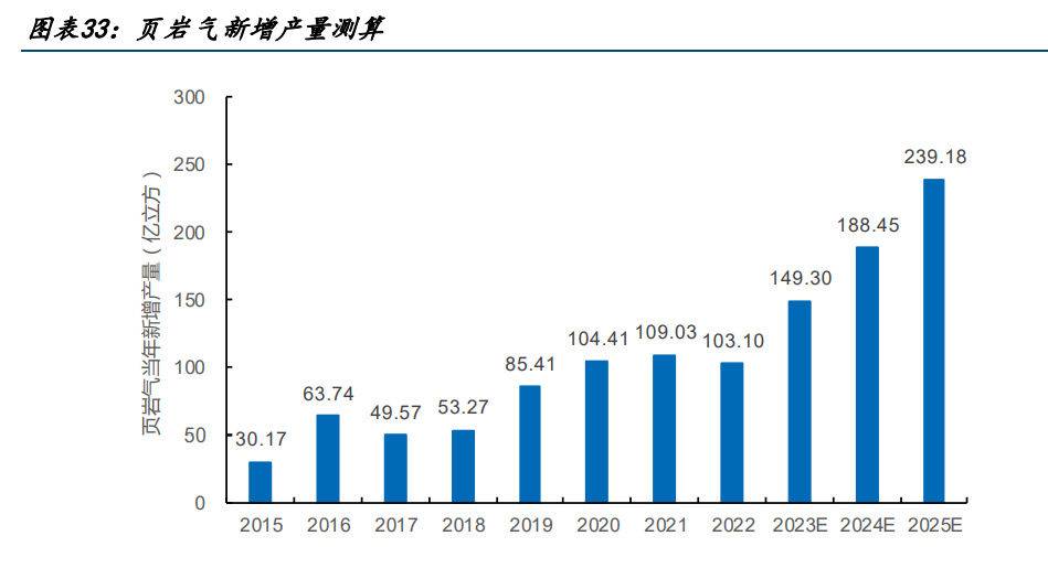 對(duì)于頁巖氣產(chǎn)量的遠(yuǎn)期預(yù)測(cè),我們結(jié)合《頁巖氣發(fā)展規(guī)劃 2016-2020》展望的 2030 年實(shí) 現(xiàn)頁巖氣產(chǎn)量 800 至 1000 億立方,與中國頁巖氣當(dāng)前勘探開發(fā)、技術(shù)進(jìn)步、設(shè)備總體形 式預(yù)測(cè),預(yù)計(jì) 25 年頁巖氣產(chǎn)量有望占到天然氣產(chǎn)量的 15%,即頁巖氣產(chǎn)量在 25 年達(dá)到 460 億方,22 至 25 年 CAGR22.62%。