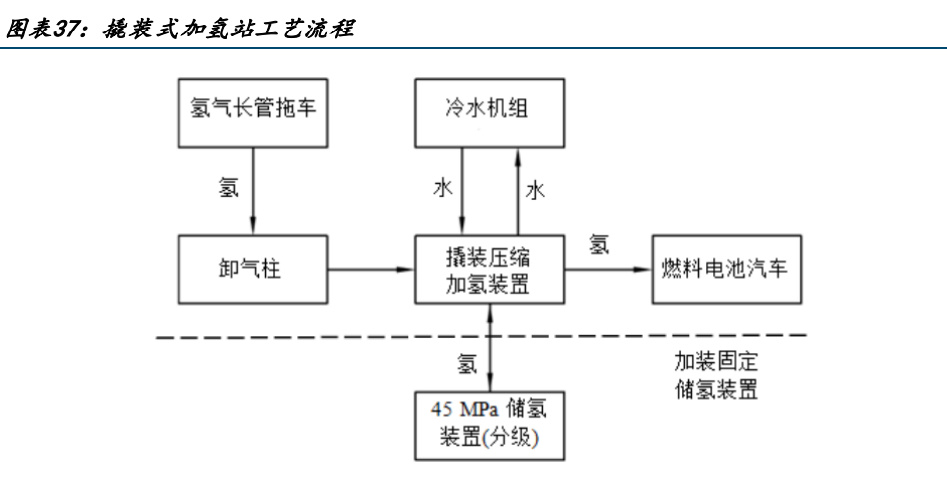 加氫站包含撬裝加氫站、固定式加氫子站、站外管道加氫母站、制氫加氫一體站: 1)撬裝加氫站:可快速完成建設(shè)并在短期投入運(yùn)營 撬裝加氫站通過氫氣長管拖車將壓力不大于 20Mpa 的壓縮氫氣運(yùn)送進(jìn)加氫站,通過卸氣柱卸氣至撬裝壓縮加氫裝置,后增壓為燃料電池車輛進(jìn)行加注(含固定儲(chǔ)氫裝置則先存入儲(chǔ) 氫裝置內(nèi))。