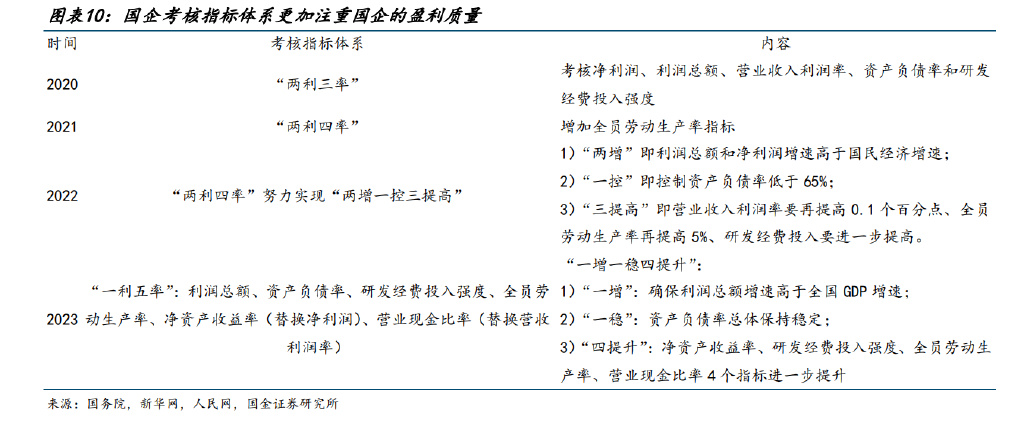 央企改革考核指標(biāo)持續(xù)優(yōu)化,新一輪改革更加重視盈利質(zhì)量、抗風(fēng)險(xiǎn)能力。新一輪央企考 核中將央企“一利五率”提出要求,即“一增一穩(wěn)四提升”,“一增”,即確保利潤總額增 速高于全國 GDP 增速,增大國資央企穩(wěn)定宏觀經(jīng)濟(jì)大盤的分量;“一穩(wěn)”,即資產(chǎn)負(fù)債率總 體保持穩(wěn)定;“四提升”,即凈資產(chǎn)收益率、研發(fā)經(jīng)費(fèi)投入強(qiáng)度、全員勞動(dòng)生產(chǎn)率、營業(yè)現(xiàn) 金比率 4 個(gè)指標(biāo)進(jìn)一步提升,新一輪央企改革更重視新增了 ROE 和現(xiàn)金流的考核,以凈資 產(chǎn)收益率(ROE)來替代營收利潤率,更加契合資本市場(chǎng)的風(fēng)格。 我們認(rèn)為本輪國企改革,考核指標(biāo)更注重盈利質(zhì)量、現(xiàn)金流的考核,代表央企盈利質(zhì)量有 望優(yōu)化,進(jìn)一步提升公司競(jìng)爭力和經(jīng)營質(zhì)量。