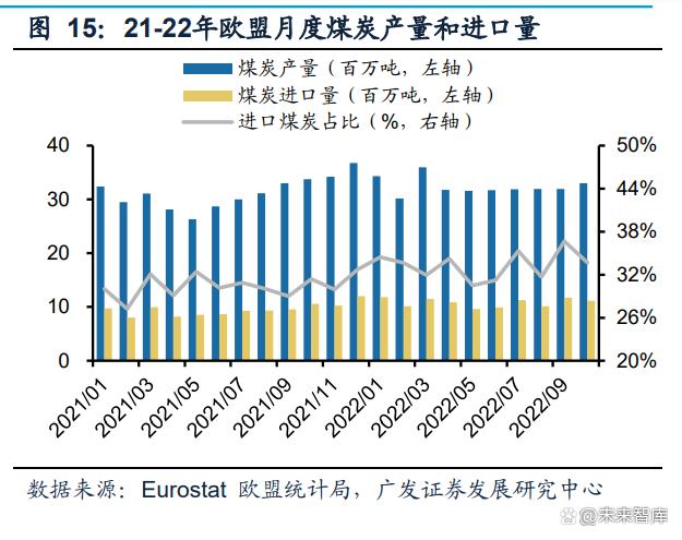 電煤需求降低、庫存增加,歐盟增量煤炭需求或?qū)⑾禄?022年歐盟電煤消費量增 加帶動煤炭消費量提升,1-8月電煤消費量同比提升16.2%,煤炭消費量同比提升 8.8%,非電煤消費量同比下降5.1%;9月后電煤消費量同比出現(xiàn)下滑,與煤電發(fā)電 量走勢一致,9月、10月電煤消費量分別同比下降0.9%、2.6%,煤炭消費量同比下 滑5.1%、6.6%。從煤炭供給量和消費量對比來看,2021年歐盟煤炭產(chǎn)量+進口量僅 超出煤炭消費量163萬噸,2022年,歐盟增加煤炭供給量,1-10月煤炭產(chǎn)量+供給量 合計4.32億噸,而消費量為4.15億噸,增加庫存1721萬噸,庫存增加、需求降低將 導(dǎo)致2023年歐盟增量煤炭需求下滑。