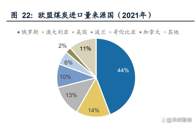 歐盟化石能源進口高度依賴俄羅斯,2021年歐盟煤炭、天然氣進口量中分別44%、 41%來自俄羅斯,俄烏沖突導(dǎo)致歐洲面臨能源價格和供應(yīng)的雙重危機。長遠來看, 歐盟實現(xiàn)能源獨立將從兩方面著手:一是多元化進口天然氣氣源,二是加速能源轉(zhuǎn) 型,提高能效,減少對化石能源的依賴,歐盟對煤炭的需求或?qū)⒊掷m(xù)下降。 煤炭:歐盟的煤炭供給量逐年下降至2021年的4.87億噸,較2000年的8.31億噸減少 41.4%,同時同步減少煤炭本土產(chǎn)量和進口量,對外依存度保持在20%~25%。從煤 炭進口來源看,歐盟煤炭前三大進口國是俄羅斯(占比44%)、澳大利亞(占比14%)、 美國(占比13%);德國和波蘭為本土的產(chǎn)煤大國,合計產(chǎn)量占歐盟總產(chǎn)量的70%。