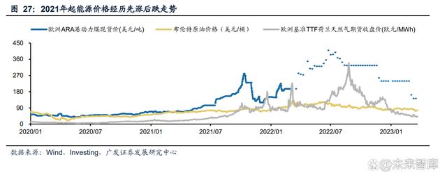 能源價格波動影響煤電、氣電發(fā)電成本,看好煤價均值回歸。作為世界上最主要的 一次能源,煤、石油、天然氣的價格主要受供需影響,一方面2023年歐盟煤電發(fā)電 量下降減少煤炭需求,另一方面碳價提升進一步提高煤電成本,長期來看需求下滑 將推動能源價格回歸,當(dāng)前氣價下降87.3%(3月23日),回歸至十年中樞附近,但煤 價相較此前高位下降65.3%(3月17日),持續(xù)看好電煤需求下降的趨勢下,煤價加 速回歸均值。