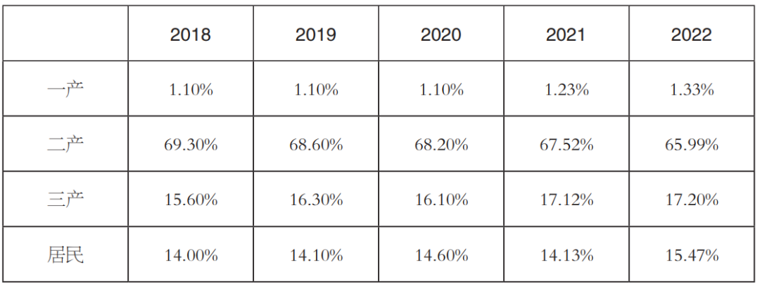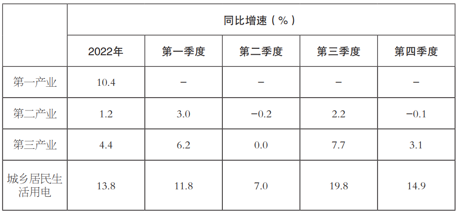 2022年,第一產業(yè)和城鄉(xiāng)居民生活用電量實現(xiàn)兩位數增長。第一產業(yè)用電量1146億千瓦時,同比增長10.4%;第二產業(yè)用電量57001億千瓦時,同比增長1.2%;第三產業(yè)用電量14859億千瓦時,同比增長4.4%;城鄉(xiāng)居民生活用電量13366億千瓦時,同比增長13.8%。