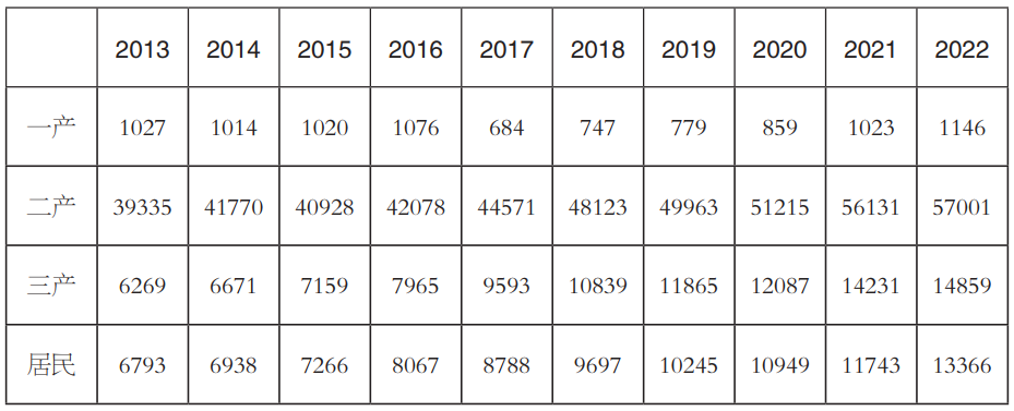 表1 2013—2022年分產業(yè)用電量(單位:億千瓦時)