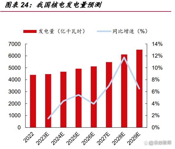 核電逐漸成為我國發(fā)電端的重要一環(huán)。根據(jù)中電聯(lián)預計,2023 年我國經(jīng)濟運行 有望總體回升,拉動電力消費需求增速比 2022 年有所提高。正常氣候情況下,預計 2023 年全國全社會用電量 9.15 萬億 kWh,比 2022 年增長 6%左右。預計 2023 年 底全國發(fā)電裝機容量 28.1 億 kW 左右,其中核電 5846 萬 kW。根據(jù)中國核能行業(yè)協(xié) 會預計,2035 和 2060 年,核能發(fā)電量在我國電力結構中的占比分別需要達到 10% 和 20%左右,與當前 OECD 國家的平均水平相當。 核電裝機維持合理速度增長。我們對現(xiàn)有在運、在建、核準項目進行測算,由于 2016-2018 年沒有新項目核準,因此 2023-2026 年我國核電裝機增速相對減緩,同 時由于 2019-2022 年恢復正常核準且 2022 年核準達 10 臺機組,因此核電裝機有望 在 2027-2029 年達到小高潮,至 2029 年底達 8365.7 萬 kW,2023-2029 年七年我 國核電裝機 CAGR 達 6.0%。根據(jù)我國核電建設進度,以及法國按照電力結構 PPE 計劃每年關閉同等數(shù)量的核電機組,我國在運核電機組數(shù)量預計在 2024 年超過法國 達到世界第二位。