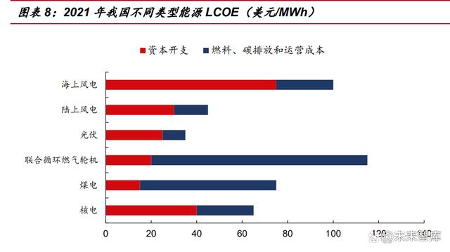 核電項目初期建設投資高,但綜合考慮運營、燃料、廢物處理費用后的全生命周 期成本后,競爭力凸顯。即使三代核電造價提升,其經(jīng)濟性仍然很強。而且國內(nèi)核電 設計壽命 40-60 年有余量,到期后一般會申請延壽 20 年,進一步增強了核電的盈利 能力。用平準化度電成本 LCOE 來評測,根據(jù) IEA 測算,2021 年我國壓水堆核電站 LCOE 約為 65 美元/MWh,僅次于光伏的 35 美元/MWh 和陸風的 45 美元/MWh,且 相對煤電具有優(yōu)勢。作為基荷能源,考慮長期運營成本,從成本端對火電、燃氣發(fā)電 擁有極強替代能力。