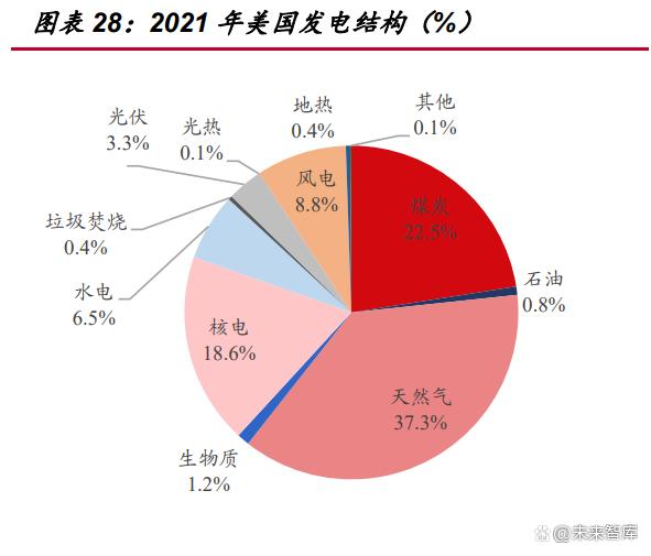 核電發(fā)電量占比穩(wěn)定。在美國發(fā)電結構中,1990年以來核電一直維持在20% 左右水平。天然氣發(fā)電成本相對較低,21 世紀頁巖氣革命再度夯實天然氣 成本優(yōu)勢,天然氣發(fā)電比例快速增長。近年來天然氣價格波動明顯,以及電 源清潔型的重視程度提升,光伏風電成本的快速下降,其占比逐漸提升。