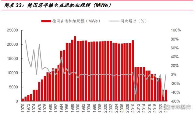 核事故安全問題引發(fā)民眾反對態(tài)度,德國核電走出倒 U 型曲線。同樣受到 1974 年能源危機影響,能源獨立問題受到關注,德國大力發(fā)展核電,直到 1989 年前德國 核電裝機都處于快速增長狀態(tài)。1986 年切爾諾貝利事故后,德國核電發(fā)展陷入停滯, 最后一座新核電站于 1989 年投入使用。 2011 年福島核事故后,德國走上了堅定退核的道路。到 2011 年初,德國 17 座 核電機組規(guī)模 21.5GW,占總電源裝機容量的 15%,核電發(fā)電量比例接近 30%。2011 年 12 月福島核電站事故后,德國多臺核電機組關停,2011 年底核電在運規(guī)模驟降至12.1GW,2022 年底僅余 3 臺機組。規(guī)模 4.1GW。受俄烏事件和北溪管道事故影響, 德國宣布暫緩核電退出計劃,推遲關停原定 2022 年內(nèi)退役的 3 座核電站。