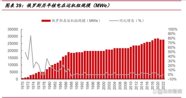 俄羅斯正處于核電的穩(wěn)步發(fā)展期,包括新技術研發(fā)以及產(chǎn)品出口。2022 年底俄 羅斯核電在運機組 27.7GW,同比持平,在建 2.7GW。2020 年俄羅斯核電發(fā)電量 2157 億 kWh,占總發(fā)電量比例 20%。除本土建設外,核電產(chǎn)品以及服務的出口是俄羅斯的重要政策和經(jīng)濟目標,20 多座核電反應堆已確認或計劃出口建設。