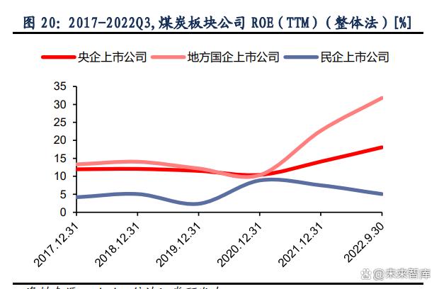 ROE 數(shù)據(jù)方面,煤炭地方國企上市公司表現(xiàn)優(yōu)于央企上市公司。受益于煤炭價格的提升, 資產(chǎn)收益率在 2020 年后迎來了大幅度增長。民企上市公司整體表現(xiàn)弱勢,ROE 呈下降趨 勢,遠(yuǎn)低于國企央企表現(xiàn)。PB 估值方面,2020 年后隨著企業(yè)經(jīng)營效益改善和煤炭板塊整體 股價的提升,國企央企上市公司的該項指標(biāo)也有一定程度的增長,走勢與 ROE 接近。但考 慮到 ROE 的增長幅度更為明顯,我們認(rèn)為 PB 的增長仍不足以完全反應(yīng)企業(yè)效益增長的速 度。而煤炭行業(yè)在能源政策導(dǎo)向調(diào)整與電力市場化加速推進(jìn)背景下,疊加新一輪煤礦產(chǎn)能周 期,供需或?qū)㈤L期趨緊,煤炭公司的高收益有望維持,內(nèi)在價值有望逐漸被市場認(rèn)可,估值 有望迎來進(jìn)一步修復(fù)。