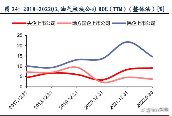油氣板塊 ROE 數(shù)據(jù)方面,與煤炭,電力板塊不同,油氣民企上市公司總體高于央企和地方 國企,我們認(rèn)為,這主要是由于以“三桶油”為代表的央國企的煉油主業(yè)毛利率較低,主要 服務(wù)于國家戰(zhàn)略;而民企公司主業(yè)以大煉化為主,經(jīng)營效率更高,成本更低。根據(jù) 2022 年 三季報,SW 油氣煉化工程板塊,ROE(整體法)為 1.19%;而 SW 煉油化工板塊,ROE (整體法)則為 9.82%。在 PB 估值方面,央企公司顯著低于地方國企和民企,甚至部分處 于破凈狀態(tài),在未來估值重塑方面或有更大空間。