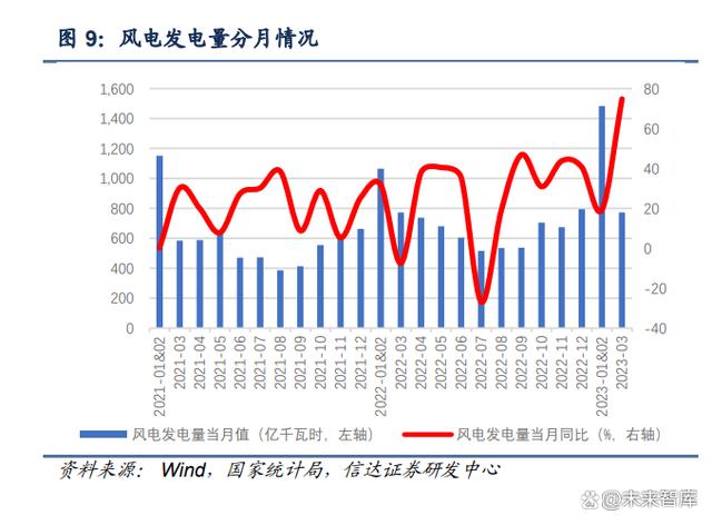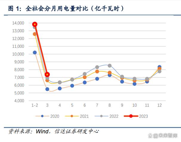 結(jié)構(gòu)方面,2023Q1 第一產(chǎn)業(yè)用電量同比增長 9.7%,第二產(chǎn)業(yè)用電量同比增長 4.2%,第三產(chǎn)業(yè)用電量同比增長 4.1%,而城鄉(xiāng)居民生活用電量同比增長僅 0.2%(一二三產(chǎn)及居民 生活用電占全社會用電量的比重分別為 1.25%、65.17%、17.43%、16.15%),居民生活 用電的低增長拖累一季度整體用電量的增速。從電力消費彈性系數(shù)來看,2022 年度全社會 用電量增速為 3.6%,GDP 增速為 3%,電力消費彈性系數(shù)達到 1.2;然而受居民生活用電 2023Q1 增速大幅放緩的影響,2023Q1 我國在實現(xiàn) 4.5%的 GDP 增速同時,用電量增速僅 3.6%,電力消費彈性系數(shù)下降至 0.8。 其中,1-2月一、二、三產(chǎn)業(yè)和城鄉(xiāng)居民生活用電量分別同比變化6.64%、3.48%、-0.11%、 2.75%,而 3 月單月的一、二、三產(chǎn)業(yè)和城鄉(xiāng)居民生活用電量分別同比變化 18.65%、 6.67%、14.04%、-5.76%。3 月以來開工復蘇潮表現(xiàn)明顯,二產(chǎn)用電增速穩(wěn)中向好,三產(chǎn) 用電增速大幅反彈,但 3 月份居民生活用電同比下降 5.76%,相較于去年同期(2022 年 3 月)高達 8.92%的居民生活用電增速,降幅高達 14.68pct。暖冬對于居民生活用電影響較 大,2 月下旬至 3 月上旬,我國中東部地區(qū)氣溫明顯升高,相比常年同期偏暖。