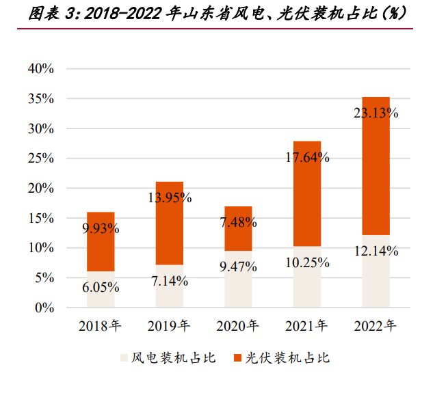 在新能源占比較高的地區(qū),相應時段電價較低。由于新能源發(fā)電邊際成本低的特 質,在新能源高發(fā)期間,如果用電需求較低,則相應時段市場電價較低。以山東省電 力現(xiàn)貨市場為例: 2018-2022 年,山東省風電、光伏裝機容量及發(fā)電量持續(xù)增長,風電、光伏裝機 容量自 1146/1361 萬千瓦增長至 2302/4270 萬千瓦,CAGR 達 14.97%/25.69%,風電、 光伏裝機占總裝機量比例自 6.05%/9.93%擴張至 12.14%/23.13%;風電、光伏發(fā)電量 占總發(fā)電量比例自 2.32%/0.55%擴張至 5.28%/11.25%。
