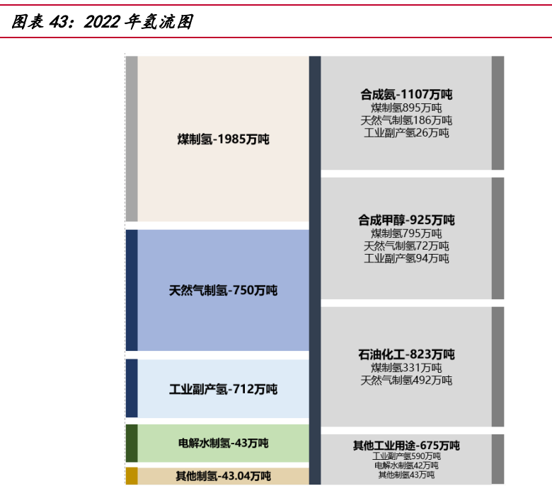 當(dāng)前國(guó)內(nèi)氫能大部分應(yīng)用于工業(yè)領(lǐng)域,包括合成氨、合成甲醇及石油化工。隨著 長(zhǎng)期碳中和目標(biāo)的提出,氫氣的能源屬性將逐漸顯現(xiàn),應(yīng)用領(lǐng)域?qū)⒅鸩酵卣怪岭娏Α?交通、建筑等場(chǎng)景。以中國(guó) 2022 年氫產(chǎn)能下游應(yīng)用為例,其中合成氨氫氣需求 1107 萬(wàn)噸,占 31.1%。合成氨作為化肥和其他化工產(chǎn)品的重要原材料,60%用于農(nóng)業(yè)化肥生 產(chǎn),30%用于工業(yè)生產(chǎn),而交通部門(mén)(船舶運(yùn)輸)和發(fā)電部門(mén)(摻氨燃燒)占比很低。 合成甲醇?xì)錃庑枨?925 萬(wàn)噸,占 26.2%。合成甲醇大部分用于化工合成,主要合成 產(chǎn)品為烯烴、甲醛、醋酸、MTBE 以及二甲醛等。石油煉化氫氣需求 823 萬(wàn)噸, 占 23.3%。 未來(lái),氫氣因其熱值高,質(zhì)量能量密度大的特點(diǎn)或?qū)⒈粡V泛應(yīng)用于交通領(lǐng)域,氫 燃料電池汽車(chē)比傳統(tǒng)的純電動(dòng)車(chē)具備更長(zhǎng)的續(xù)航能力。2022 年我國(guó)氫燃料電池車(chē)?yán)?計(jì)銷(xiāo)量 12682 輛,加氫站累計(jì)建成 274 座,依據(jù)中國(guó)國(guó)家發(fā)展和改革委員會(huì)發(fā)布《氫 能產(chǎn)業(yè)發(fā)展長(zhǎng)期規(guī)劃(2021-2035)》提出,到 2025 年燃料電池車(chē)輛保有量約為 5 萬(wàn) 輛。同時(shí),因氫氣單位質(zhì)量的熱值遠(yuǎn)大于天然氣,能夠更好地滿(mǎn)足建筑供熱需求而應(yīng) 用于建筑發(fā)電等其他領(lǐng)域。