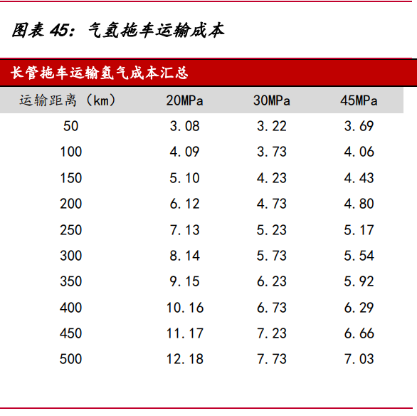 氣氫拖車(chē)是目前國(guó)內(nèi)最成熟的氫氣運(yùn)輸形式,我國(guó)氫氣管束式集裝箱和氫氣長(zhǎng)管 拖車(chē)大多采用鋼制大容積無(wú)縫高壓氣瓶和鋼制內(nèi)膽碳纖維環(huán)向纏繞氣瓶,工作壓力通 常為 20Mpa,單次運(yùn)輸氫氣質(zhì)量小,運(yùn)輸效率低,適用于 200 公里以?xún)?nèi)的短距離運(yùn)輸。 綜合市場(chǎng)上管束式氫氣集裝箱的平均輸氫量,假設(shè) 20/30/45MPa 管束式集裝箱最大可 運(yùn)輸氫氣質(zhì)量 340/650/950 千克,管束式集裝箱費(fèi)用 60/70/80 萬(wàn),單位壓縮電耗 2/4.5/6kWh/kg,則運(yùn)距 500 公里的運(yùn)輸成本高達(dá) 7 元/kg 以上。