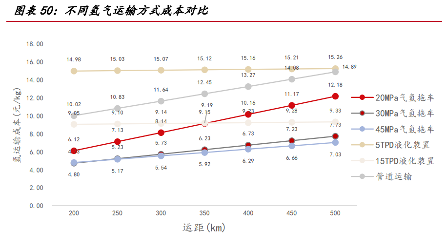 目前國(guó)內(nèi)氣氫拖車(chē)運(yùn)輸?shù)慕?jīng)濟(jì)性明顯,且廣泛用于商品氫氣運(yùn)輸。而國(guó)外大多采 用液氫運(yùn)輸,運(yùn)輸方式已較為成熟,同時(shí),國(guó)內(nèi)管道建設(shè)與西方國(guó)家仍存在較大差距, 美國(guó)氫氣管道規(guī)模最大,總里程達(dá)到 2720km,歐洲輸氫總里程也已突破 1500km,我 國(guó)氫能產(chǎn)業(yè)起步較晚,自主建設(shè)的典型純輸氫管道共有 3 條,總里程數(shù)不足 100km。 因此,適用于遠(yuǎn)距的管道運(yùn)輸和液氫運(yùn)輸受限于技術(shù)壁壘和基礎(chǔ)設(shè)施建設(shè),運(yùn)輸成本 暫時(shí)高于氣氫拖車(chē)。按考慮氧氣沖減的電氫成本 10 元/kg 計(jì)算,計(jì)及運(yùn)輸成本后, 電氫利用成本達(dá)到 16-18 元/kg,目前比煤制氫成本相對(duì)較高,電氫經(jīng)濟(jì)性大幅減弱, 盡管仍低于天然氣制氫,但氫氣實(shí)際所需運(yùn)距較長(zhǎng),運(yùn)往現(xiàn)存下游產(chǎn)能依然受限。