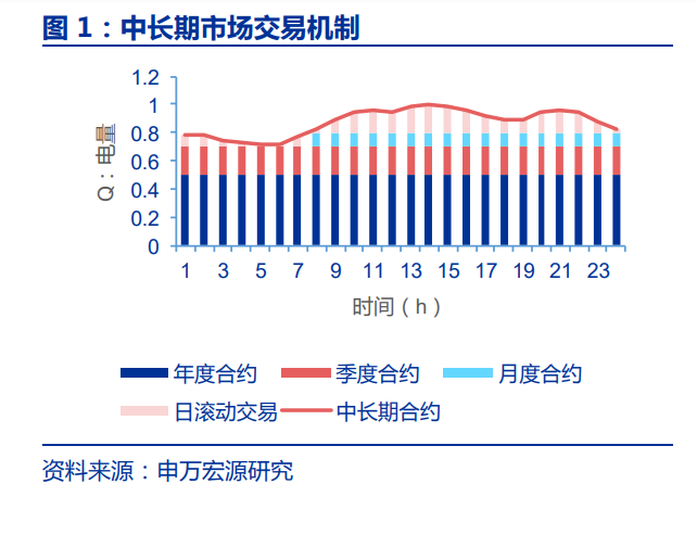 如果把上述五個方向繼續(xù)向下展開,涉及到的品種多達十幾種,紛繁復(fù)雜的電力交易 品種以及各不相同的機制提高了對電力市場研究的門檻。但從電力系統(tǒng)運行的本質(zhì)來說, 不論是電能量市場、輔助服務(wù)市場還是容量電價,大體上都是要實現(xiàn)兩個功能:有功平衡 和無功平衡。 有功平衡即電力系統(tǒng)需要保持發(fā)電功率和用電負(fù)荷時時刻刻相等。為了保證供電的可 靠性以及用電成本的穩(wěn)定性,用戶側(cè)需要提前安排和預(yù)測其未來的用電需求,發(fā)電側(cè)需要提前預(yù)測其未來出力情況(風(fēng)電、光伏、水電等)或安排發(fā)電計劃(化石能源),因此需 要提前簽訂用電合約來使供需平衡。但不論新能源的出力還是用電計劃,距離用電時間越 遠把握性越小,所以根據(jù)簽訂合約時點與實際用電時點的遠近,可以分為中長期和現(xiàn)貨交 易,本質(zhì)目的是對電力合約進行分解,使得電力合約與實際用電需求盡量匹配。 中長期交易從時間尺度上可以分為年度合約、季度合約、月度合約等,現(xiàn)貨交易則主 要分為日前、日內(nèi)和實時現(xiàn)貨交易。將電能量市場根據(jù)時間尺度不同分解為不同的產(chǎn)品, 本質(zhì)上是在市場靈活性和交易成本之間取平衡,時間尺度越長靈活性越差,交易成本越低, 反之則靈活性越強但交易成本越高。