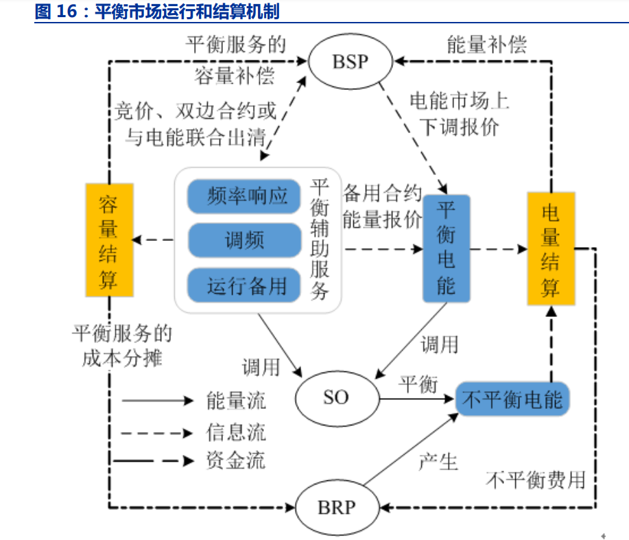 歐洲的平衡市場源于 2017 年 12 月 23 日歐盟委員會 EB 條例,該條例給出一個指導 方針,使得各國可以在平衡市場中共享資源,從而使發(fā)電量始終與用電量相等。從實際達 成的效果來看,歐洲平衡市場與我國的調(diào)頻輔助服務類似。 在平衡市場中,調(diào)度智能歸于 TSO 或者 DSO,參與平衡市場運行和結算的市場成員 包括 BSP(BalanceServiceProvider,BSP)和 BRP(BalanceResponsibilityParty,BRP) 等。其中 BSP 提供平衡資源,在實際運行中根據(jù)系統(tǒng)頻率變化或調(diào)度指令改變自身出力以 幫助系統(tǒng)恢復平衡,BRP 是承擔責任并參與不平衡結算的市場成員。
