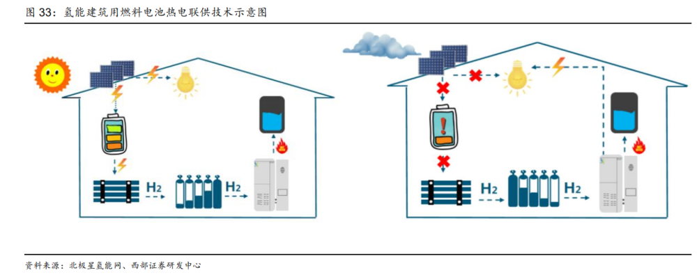 氫建筑應(yīng)用仍處于導(dǎo)入階段,未來存在較大市場(chǎng)空間。氫能建筑,是近年發(fā)展起來的一種綠色建筑新理念。它以氫能完全或部分替代市政電網(wǎng)、天然氣等傳統(tǒng)能源,滿足建筑對(duì)冷、 熱、電、生活熱水等各種能源的需求,在提高建筑用電可靠性的同時(shí),還有助于優(yōu)化國(guó)內(nèi) 的能源結(jié)構(gòu)、降低電網(wǎng)整體投資和減少問題氣體排放。 目前全球建筑供熱和電力需求約占全球能源需求的 1/3。全球多個(gè)國(guó)家積極探索氫能在建 筑領(lǐng)域應(yīng)用,利用氫氣通過發(fā)電、直接燃燒、熱電聯(lián)產(chǎn)(CHP)等形式為居民住宅或商業(yè) 區(qū)提供電熱水冷多聯(lián)供。如氫可與天然氣混合(氫氣摻混比例為 0~20%),通過基于燃?xì)?輪機(jī)或燃料電池的 CHP 技術(shù),利用現(xiàn)有建筑和能源網(wǎng)絡(luò)基礎(chǔ)設(shè)施提供靈活性和連續(xù)性的 熱能、電力供應(yīng),從而取代化石燃料 CHP。此外,100% 的純氫可通過氫鍋爐用于建筑 供熱,但氫氣價(jià)格需低至 1.5~3.0 美元/kg 時(shí),才能與天然氣鍋爐和電動(dòng)熱泵競(jìng)爭(zhēng)。而對(duì) 于分布式供暖,氫能是少數(shù)幾種可以與天然氣競(jìng)爭(zhēng)的低碳替代品,隨著制氫成本和氫鍋爐、 燃料電池成本的下降,以及氫氣利用現(xiàn)有天然氣管道輸送能力的提升,預(yù)計(jì)到 2030 年, CHP 中氫鍋爐與氫燃料電池的成本為 900~2000 美元/(戶·年),建筑熱電聯(lián)供的氫能 需求量為 3 萬~ 9 萬 t/年。