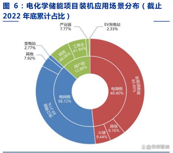 從應(yīng)用場景看,2022 年儲能應(yīng)用場景仍以新能源配儲及電網(wǎng)側(cè)獨立儲能為主。根據(jù) 中電聯(lián)統(tǒng)計口徑,截至 2022 年底,已投運的電化學儲能電站累計裝機主要分布在電源側(cè), 占比達 48.4%,其次為電網(wǎng)側(cè) 38.72%和用戶側(cè) 12.88%。2022 年各應(yīng)用場景新增裝機占 比基本保持不變,電源側(cè)占比 49.24%,其次為電網(wǎng)側(cè) 43.13%和用戶側(cè) 7.63%。從具體 場景看,新能源配儲為電源側(cè)主要場景,獨立儲能為電網(wǎng)側(cè)主要場景。