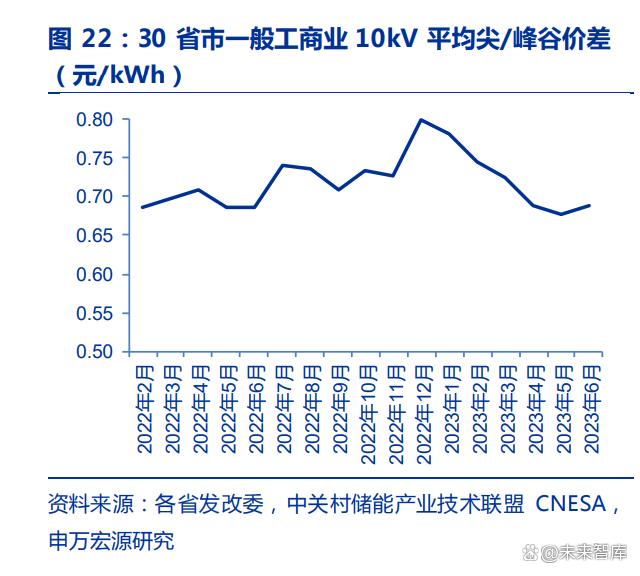 平均峰谷價(jià)差逐漸拉大,為工商業(yè)儲(chǔ)能套利提供可能性。2021 年 7 月 26 日,國(guó)家發(fā) 改委發(fā)布《關(guān)于進(jìn)一步完善分時(shí)電價(jià)機(jī)制的通知》,各省響應(yīng)出臺(tái)拉大峰谷價(jià)差。根據(jù) CNESA 數(shù)據(jù),2022 年全國(guó) 30 省市平均峰谷價(jià)差已達(dá)到 0.70 元/kWh。自 2023 年以來, 峰 谷 價(jià) 差 進(jìn) 一 步 拉 大 , 全 國(guó) 30 省 份 1-6 月 平 均 峰 谷 價(jià) 差 達(dá) 0.78/0.75/0.72/0.69/0.68/0.69 元每度,除 4 月和 5 月以外,其他月份峰谷價(jià)差較 2022 年均有所上漲。