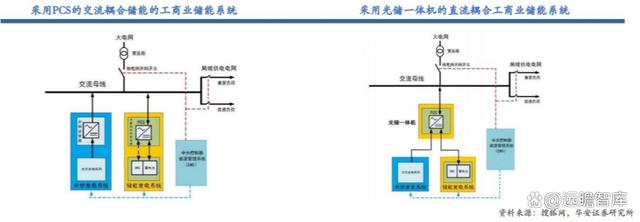 商業(yè)儲(chǔ)能系統(tǒng)架構(gòu)主要有兩種:1)采用 PCS 的交流耦合型;2)采用光儲(chǔ)一體機(jī)的直流耦合型。交流耦合系統(tǒng)與儲(chǔ)能電站的系統(tǒng)配置類(lèi)似,但相對(duì)用量較小,系統(tǒng)功能也更為簡(jiǎn)單,其中的光伏系統(tǒng)和儲(chǔ)能系統(tǒng)并聯(lián),靈活性較高,適用于已安裝工商業(yè)光伏的存量市場(chǎng)。直流耦合系統(tǒng)通過(guò)光儲(chǔ)一體機(jī)將光伏逆變器和雙向變流器整合在一起,相比交流耦合系統(tǒng)具有高度集成化、軟性成本低的特點(diǎn),50-100kW 的光儲(chǔ)一體機(jī)已逐漸成為中小工商業(yè)儲(chǔ)能系統(tǒng)的選擇。